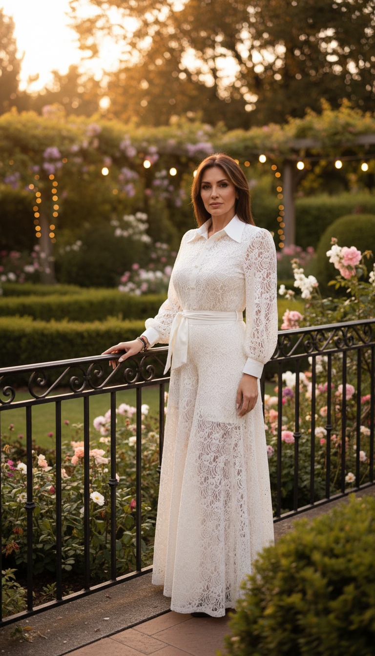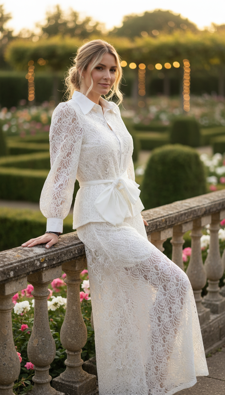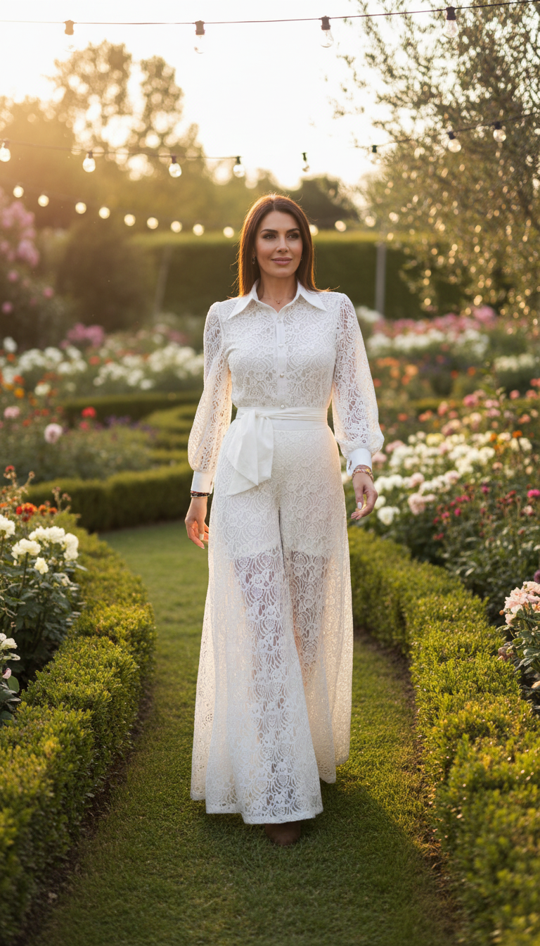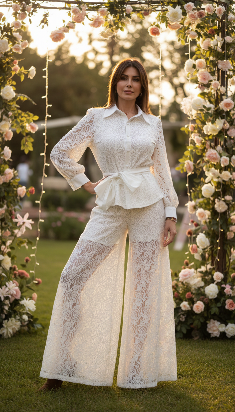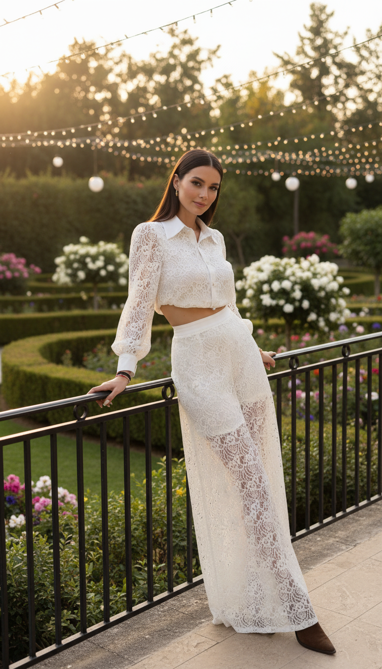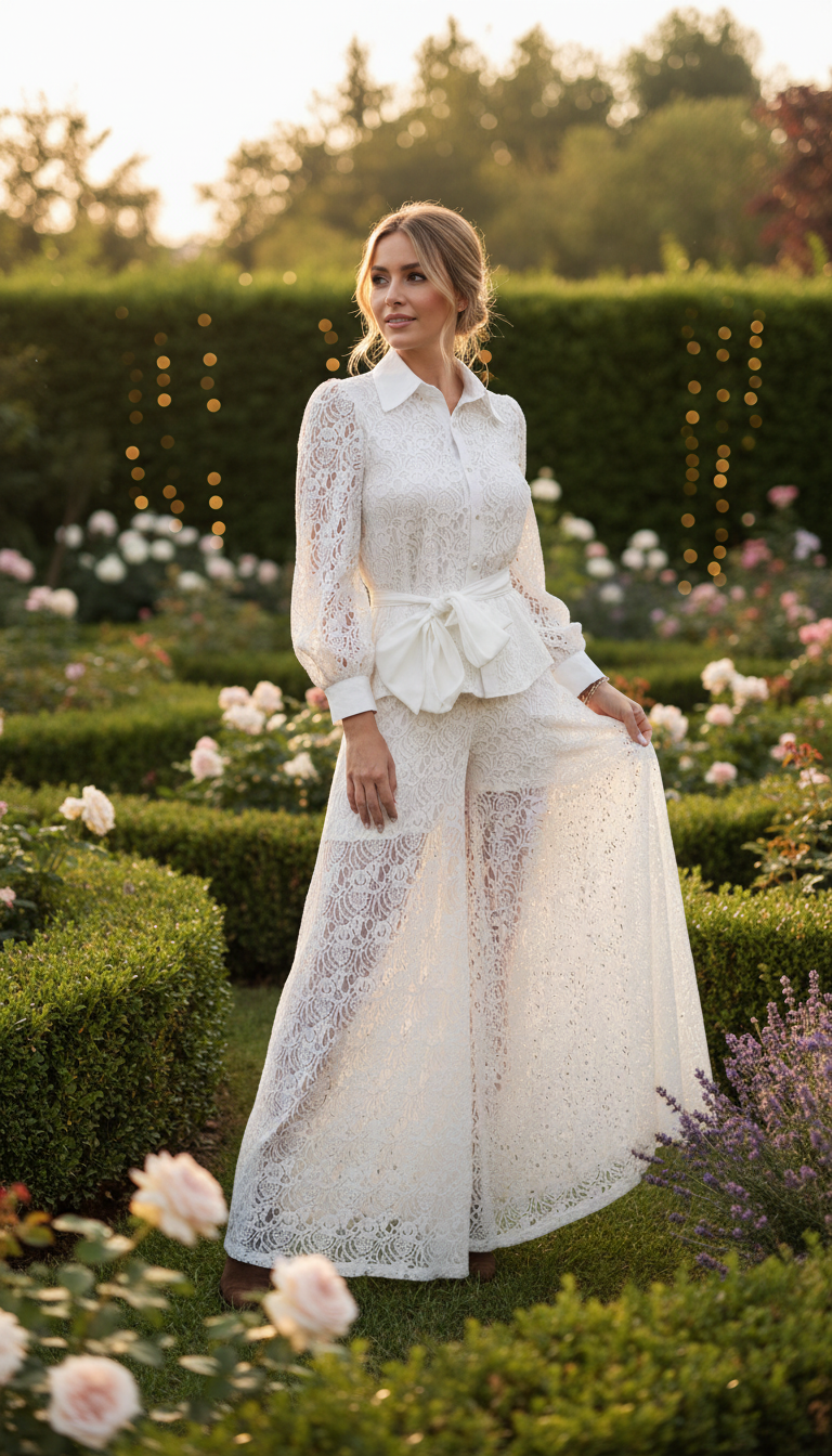 Dieses Set aus Spitze im Bohème-Stil ist aus 100 % Bio-Baumwolle gefertigt und mit einem weichen Futter aus 100 % Viskose versehen, das für Komfort, Atmungsaktivität und einen wunderschönen, fließenden Fall sorgt. Das vielseitige Set, bestehend aus einem Spitzenblusenhemd und einer passenden, weit geschnittenen Hose, verkörpert mühelose Eleganz und kreiert eine raffinierte und zugleich lässige Silhouette.