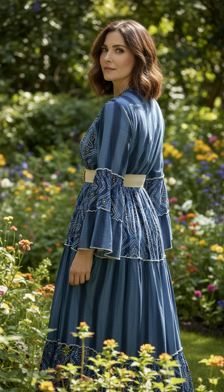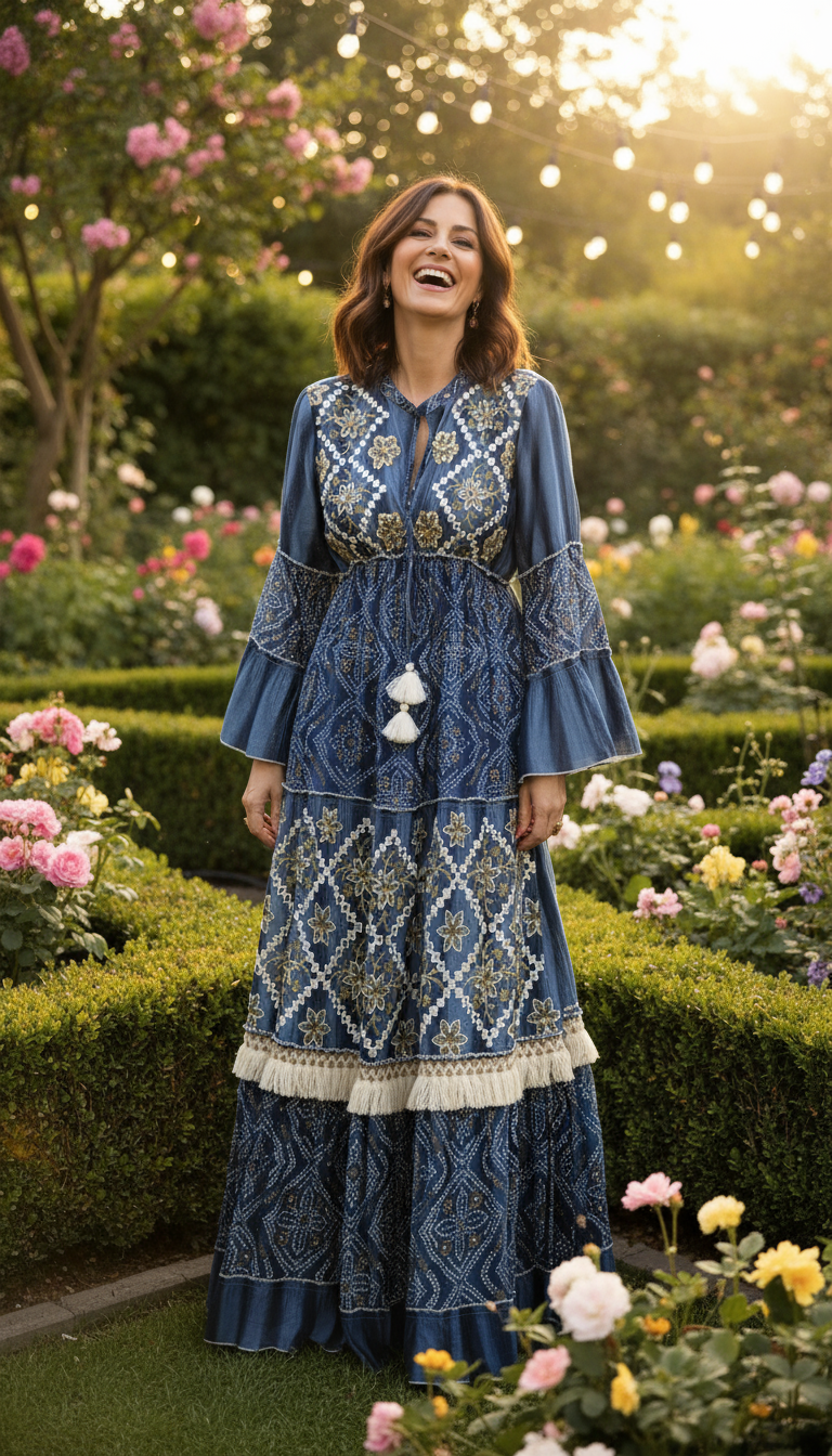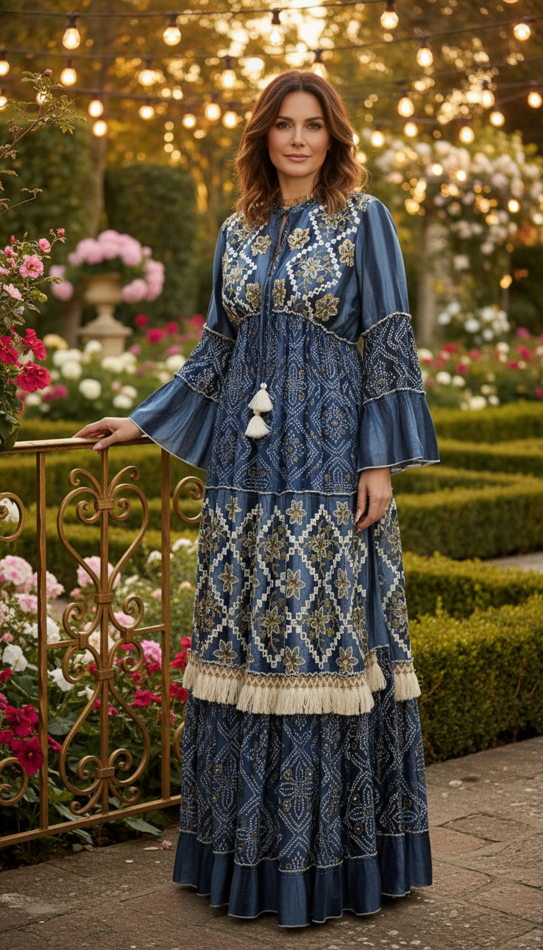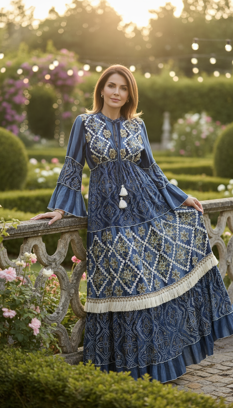 This richly embroidered dress blends artisanal detail with bohemian elegance, crafted for women who treasure unique pieces that tell a story through every thread.
